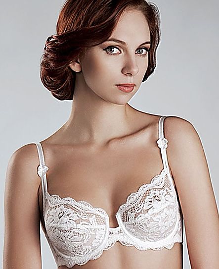 Бюстгальтер из эластичного трикотажного полотна и эластичного кружева, на каркасах. Нижние детали чашек на подкладке. Бретели типа "спагетти" декорированы бантиками.